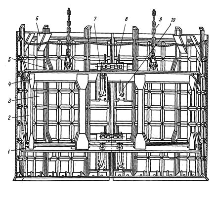 Опалубки самоотрывающиеся типа ОСД предназначены для крепления вертикальных стволов монолитным бетоном непосредственно в призабойном пространстве вслед за подвиганием забоя в условиях обводнения и взрывных работ. Опалубки изготавливаются высотой 3,3 м и 4,2 м, диаметром4,5... 8,5 м. Наличие съемного поддона позволяет перемещать опалубку в закрепленном пространстве.