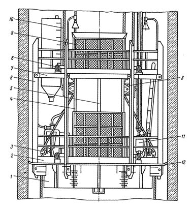 Полки проходческие состоят из балок, окаймляющего кольца, настила и выдвижных пальцев. Наружный диаметр окаймляющего кольца на 100 мм меньше диаметра ствола в свету. В полках проходческих этого типа устраивают проёмы для пропуска подвесного оборудования. Полок проходческий применяют как при проходке, так и при армировании стволов; к нижнему этажу полки-каретки подвешивают породопогрузочные машины (KC-2у, KC-1м). Двухэтажные или многоэтажные полки-каретки и подвесные полки состоят из этажных площадок, а также стоек, лыж, соединяющих этажные площадки, и прицепного устройства.